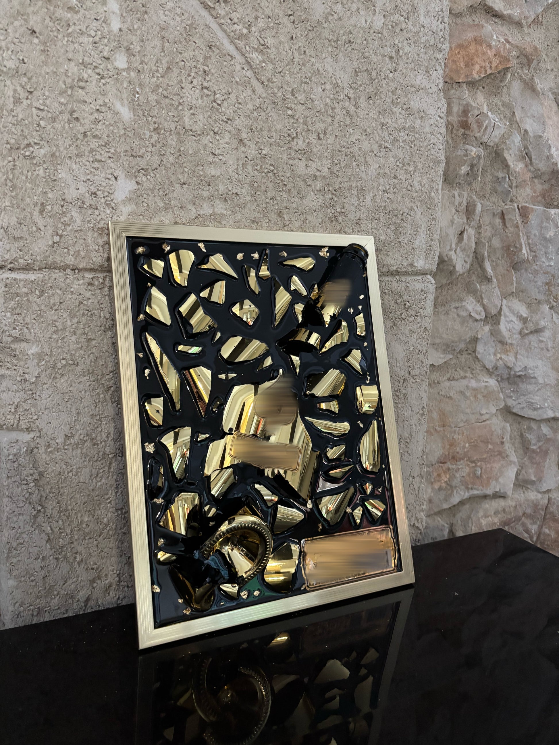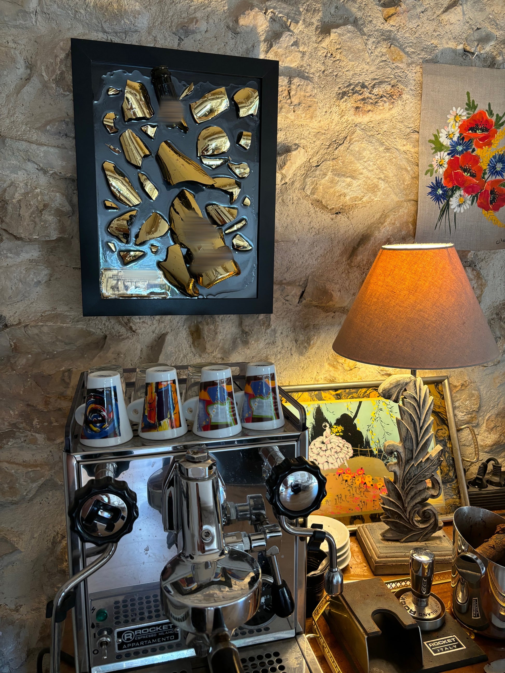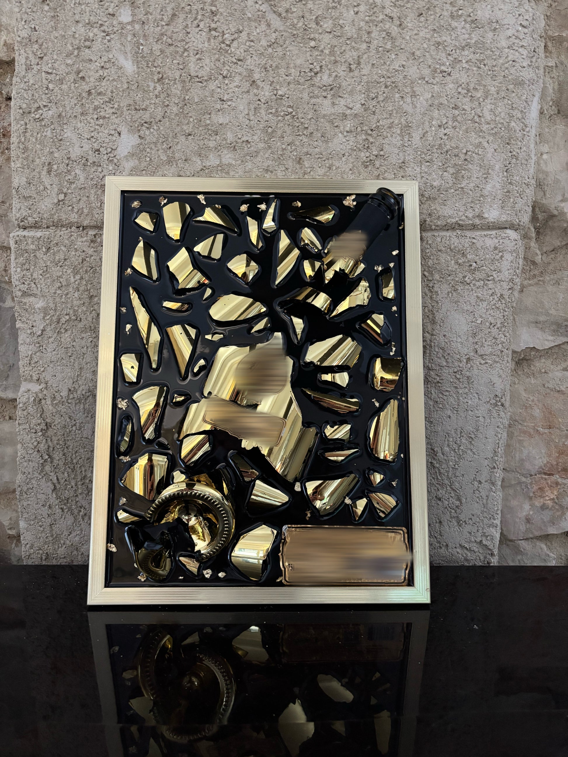 Réalisée à partir d’une bouteille de champagne authentique, minutieusement fragmentée puis intégrée à la résine époxy.
