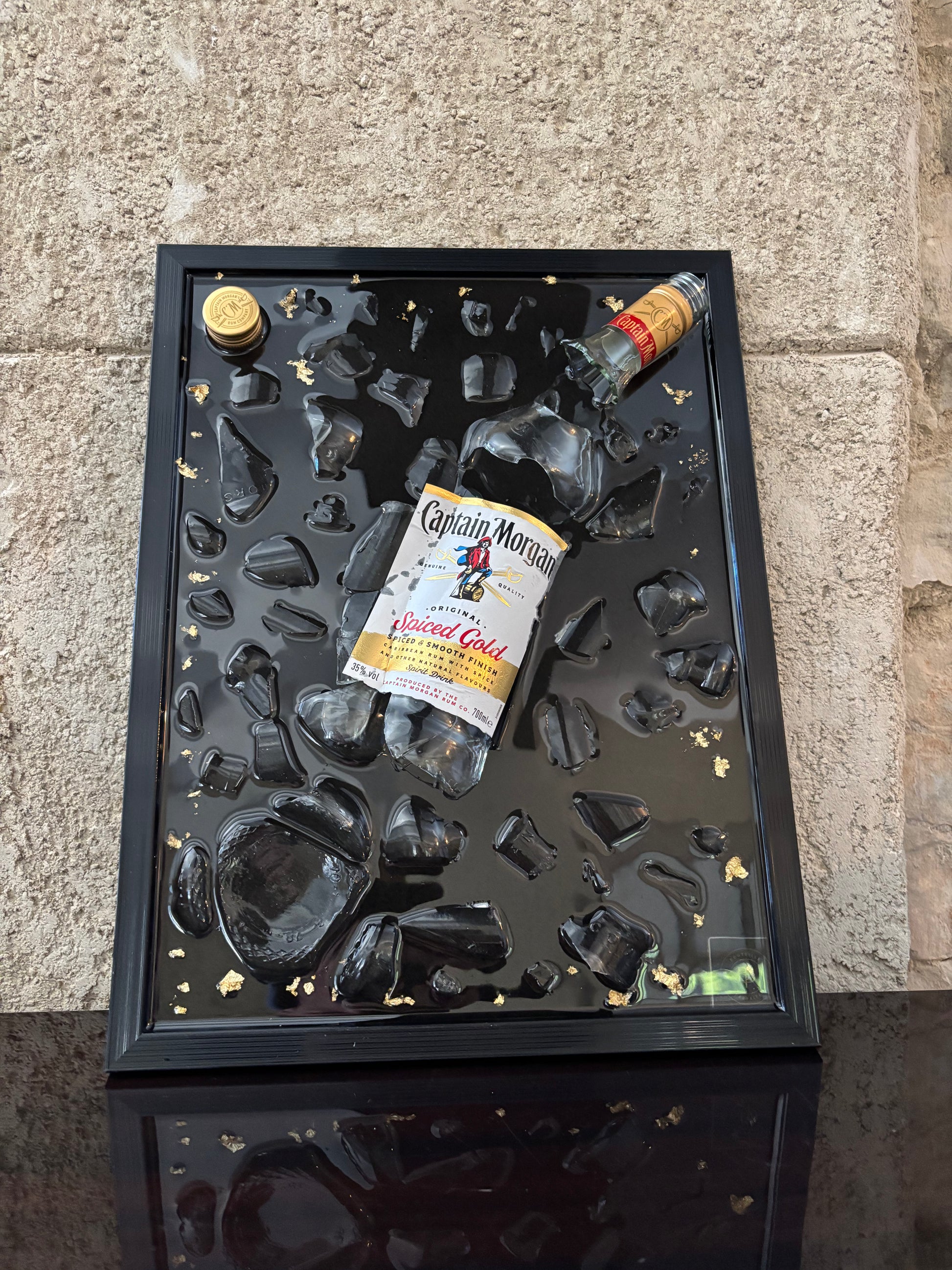 Création artisanale unique réalisée à partir d’une bouteille vide authentique. Produit non affilié à la marque Diageo, que j’ai brisée avant de placer chaque éclat de verre, un par un, dans la résine époxy.