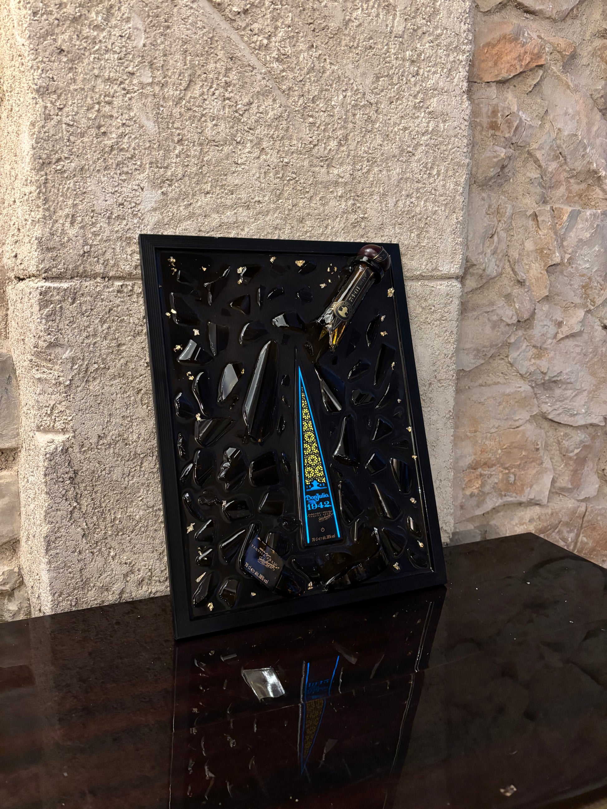 Pour celui-ci, j’ai utilisé une véritable bouteille de Don Julio 1942, que j’ai soigneusement brisée avant de placer chaque éclat de verre, un par un, dans la résine epoxy. Produit non affilié à la marque Don Julio 1942,