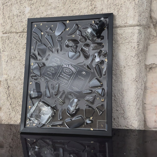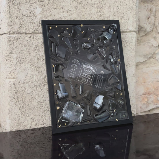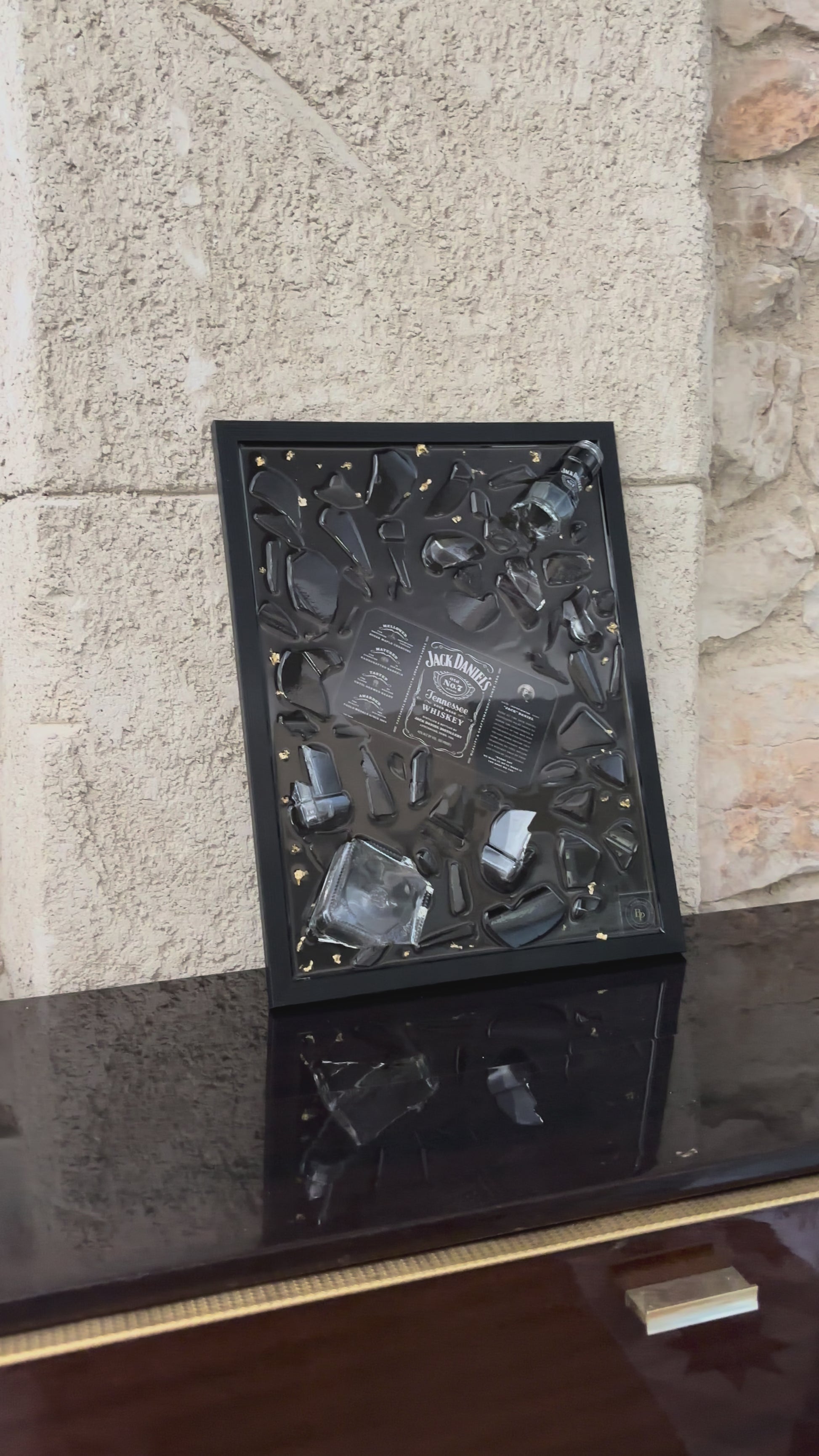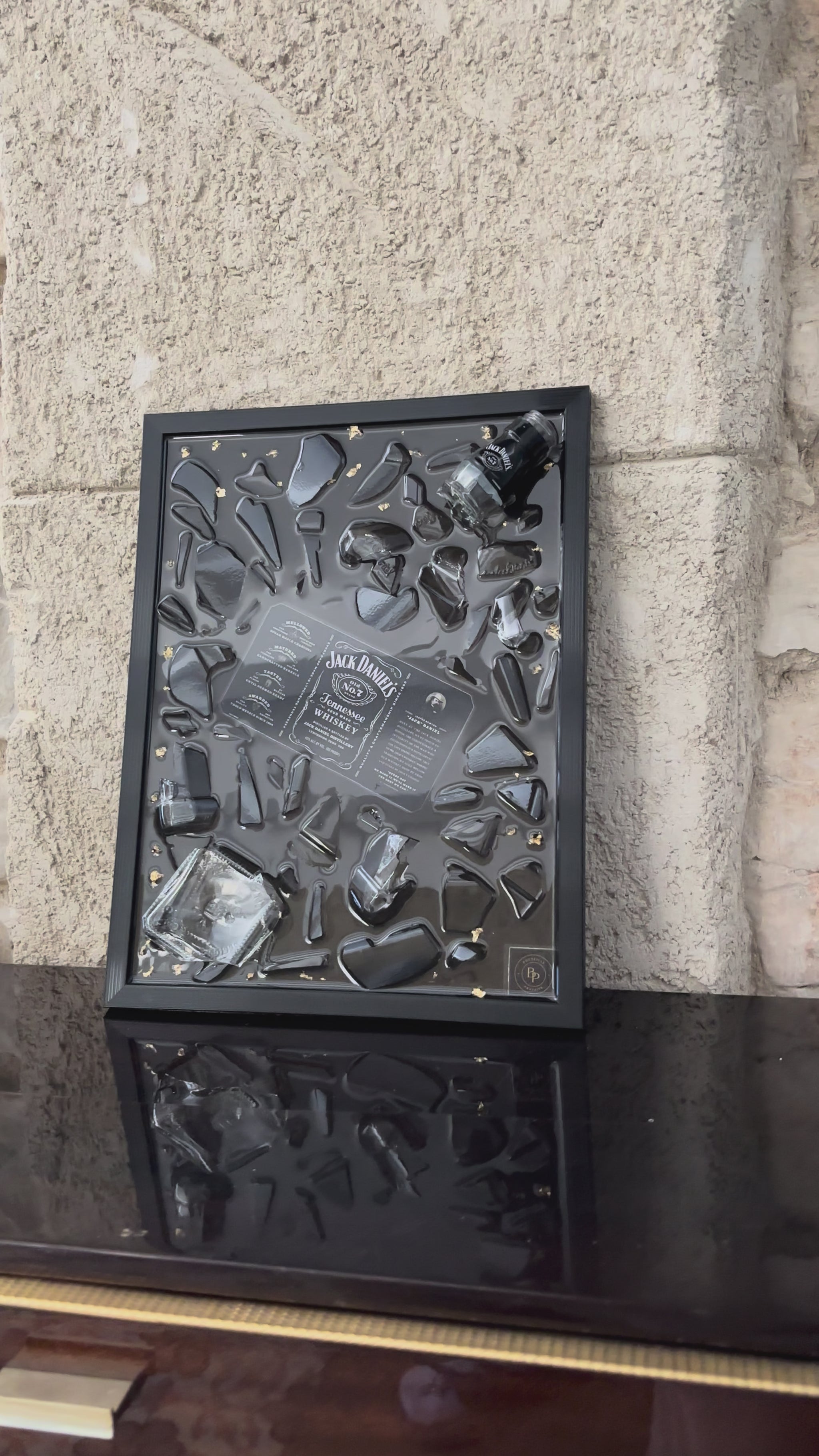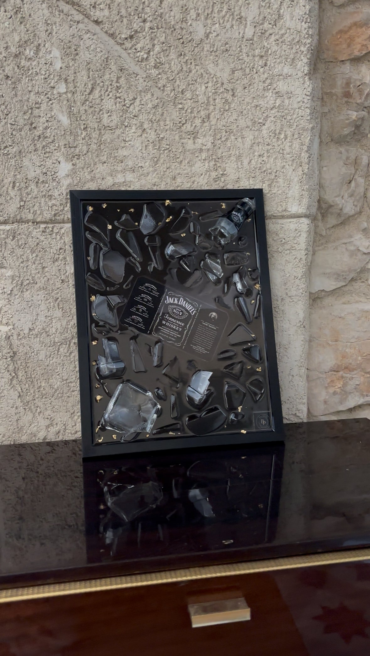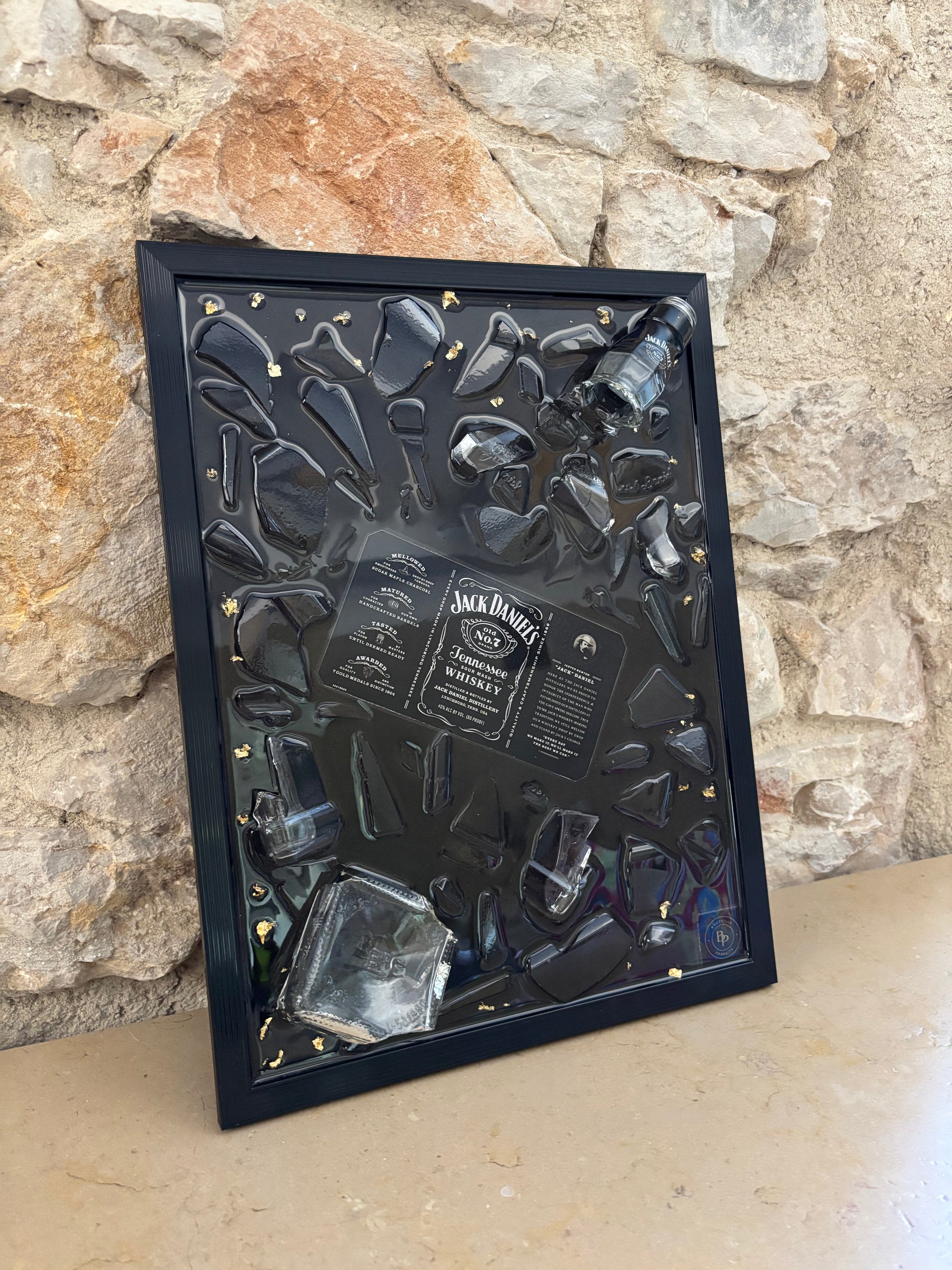 Création artisanale unique réalisée à partir d’une bouteille vide authentique. Produit non affilié à la marque Jack Daniel’s, que j’ai brisée avant de placer chaque éclat de verre, un par un, dans la résine époxy.