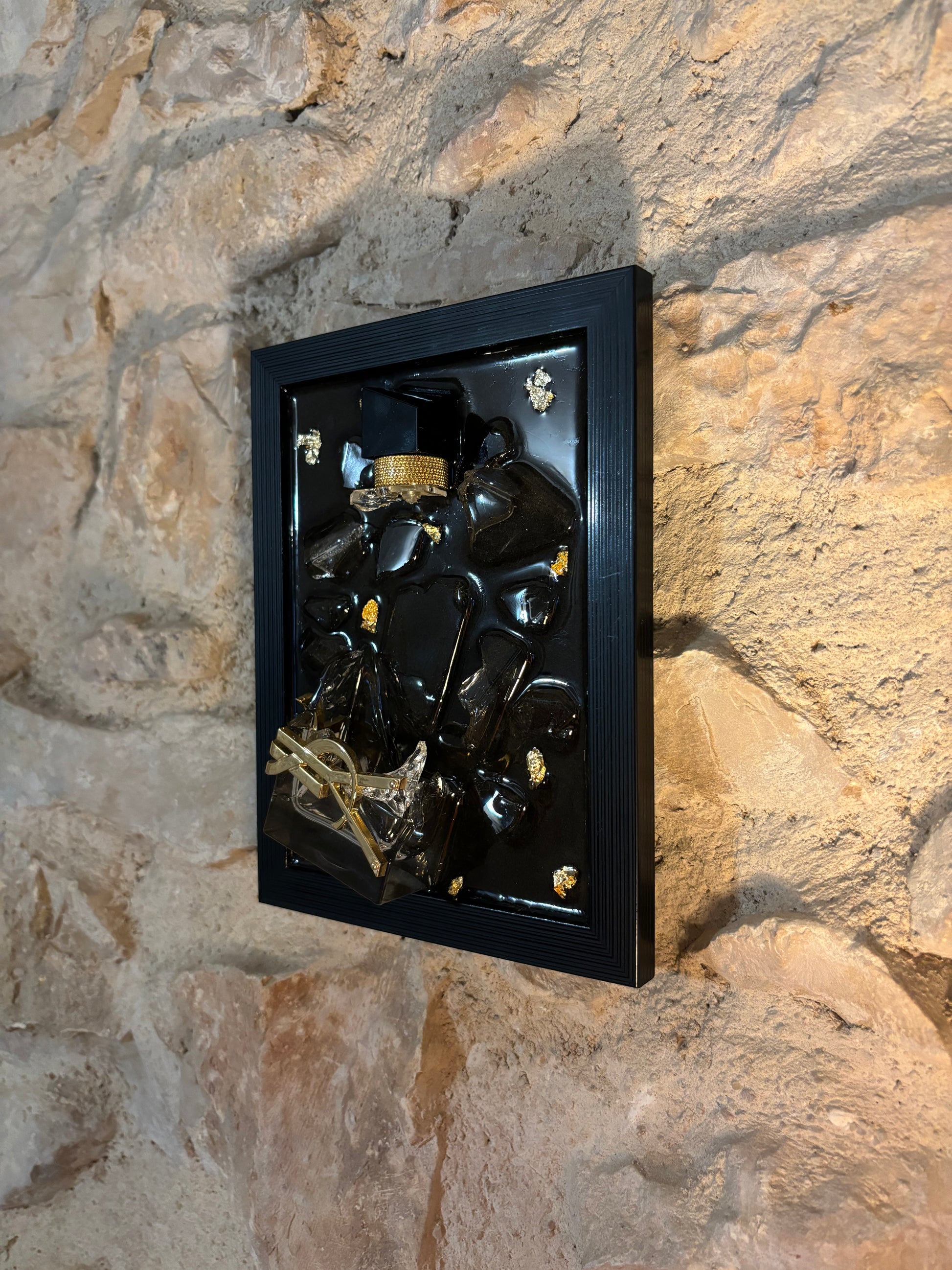 Pour celui-ci, j’ai utilisé un flacon de parfum Libre de Yves Saint Laurent, que j’ai soigneusement brisée avant de placer chaque éclat de verre, un par un, dans la résine epoxy.