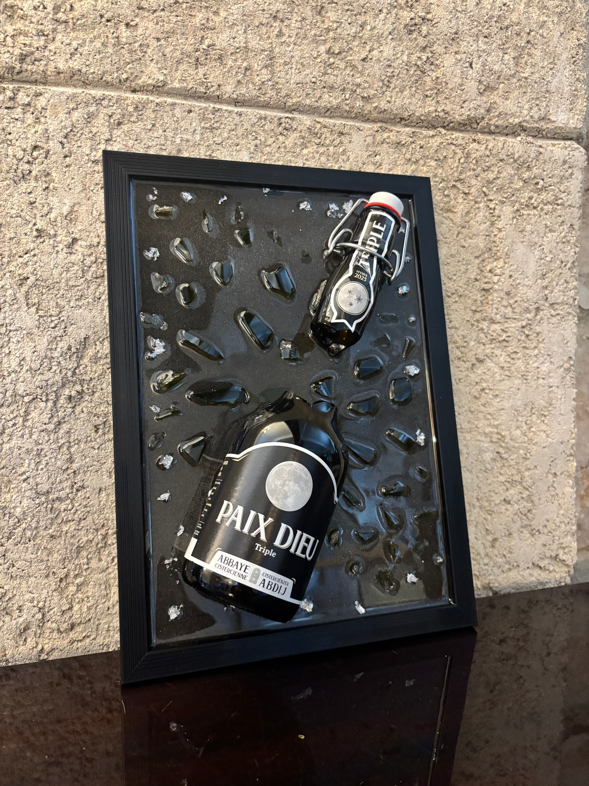 Création artisanale unique réalisée à partir d’une bouteille vide authentique. Produit non affilié à la marque Paix Dieu, que j’ai brisée avant de placer chaque éclat de verre, un par un, dans la résine époxy.